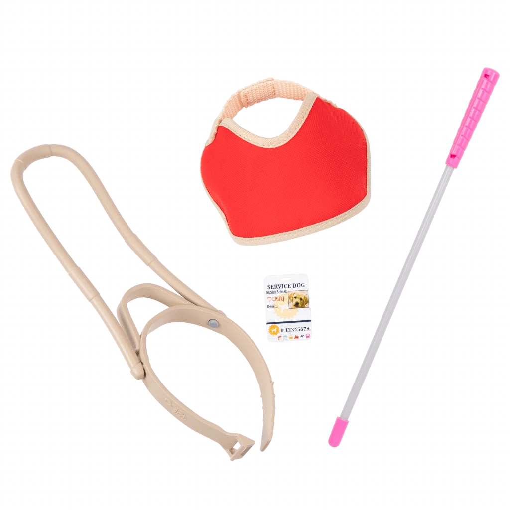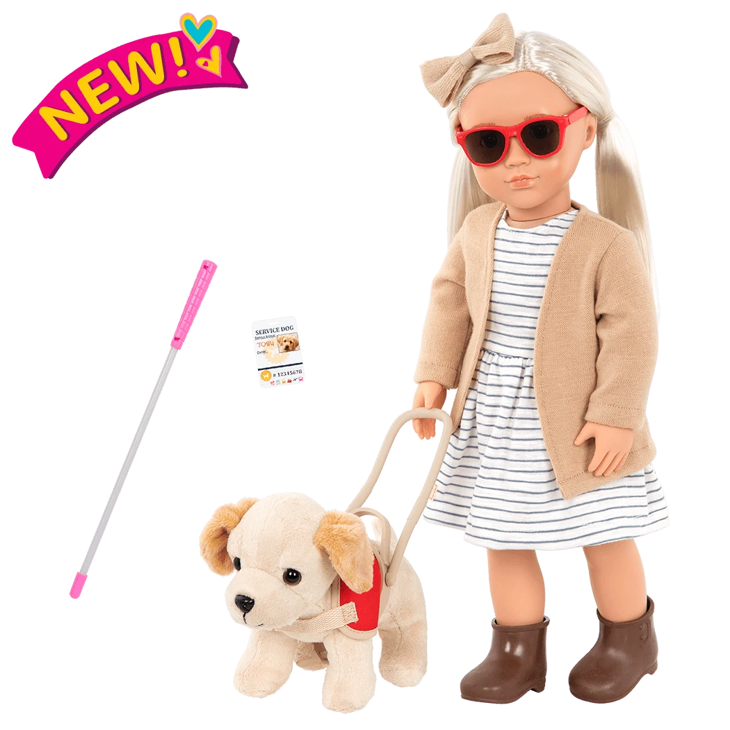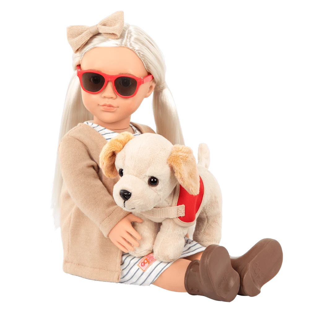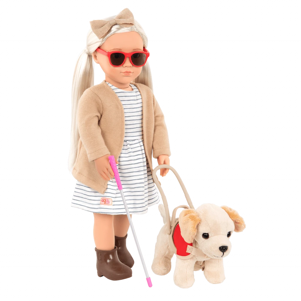 Meet the Our Generation 18-inch doll Marlow and her super cute guide dog! She has brown eyes that open and close, and her long blonde hair is lots of fun to brush and style. Marlow is visually impaired, and she relies on her loyal pal to help guide her around the town. When it’s time to head out, dress her pup in the bright red dog vest and harness. They comfortably fit all Our Generation plush dogs, so lots of best furry friends can help Marlow travel the OG neighborhood!