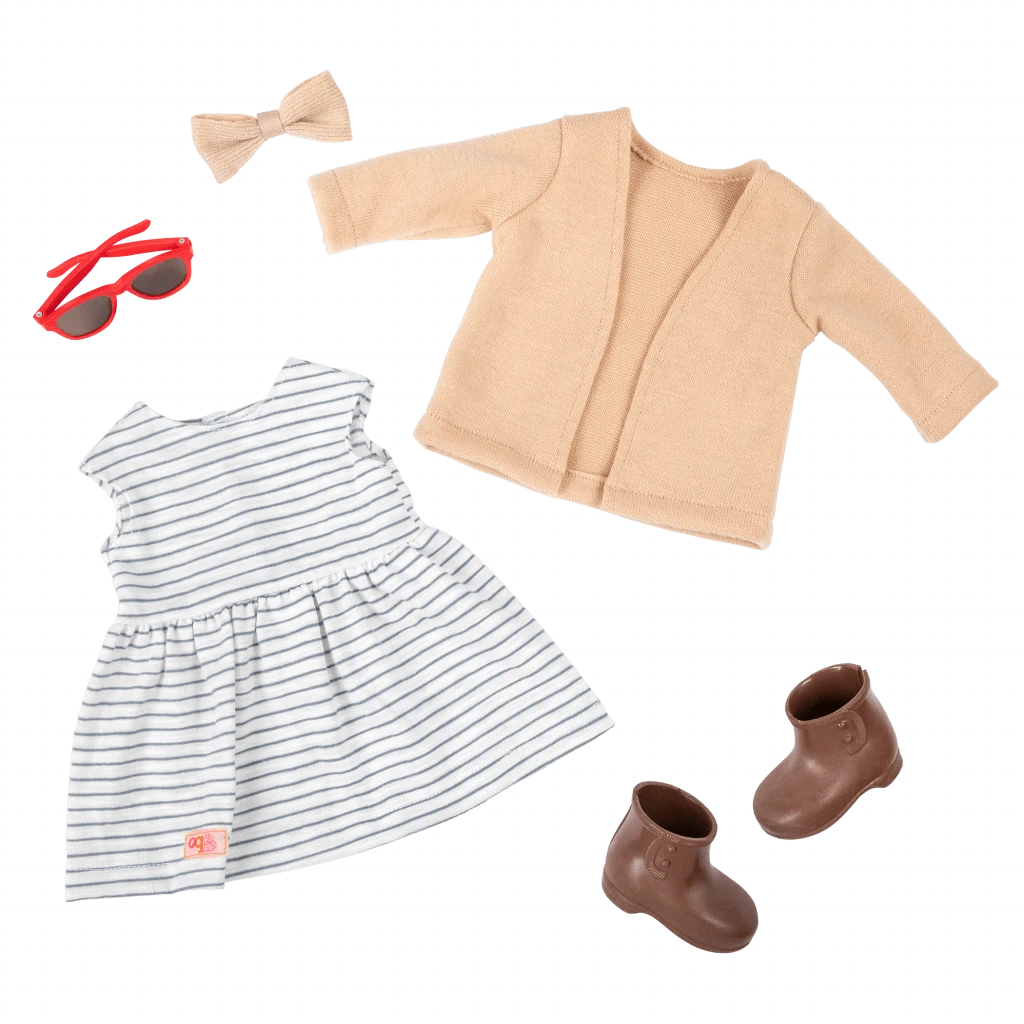 Give Marlow an extra helping hand with the blind cane as she travels, and she can rotate her arms and legs to easily change outfits to match each of her adventures. She arrives in a cute striped dress with a long, trendy beige cardigan and matching booties. And her large hair bow accessory adds playful fun to her hairstyles! Her outfit also features easy-open closures to quickly put on and remove, so you can give Marlow many different looks every day!