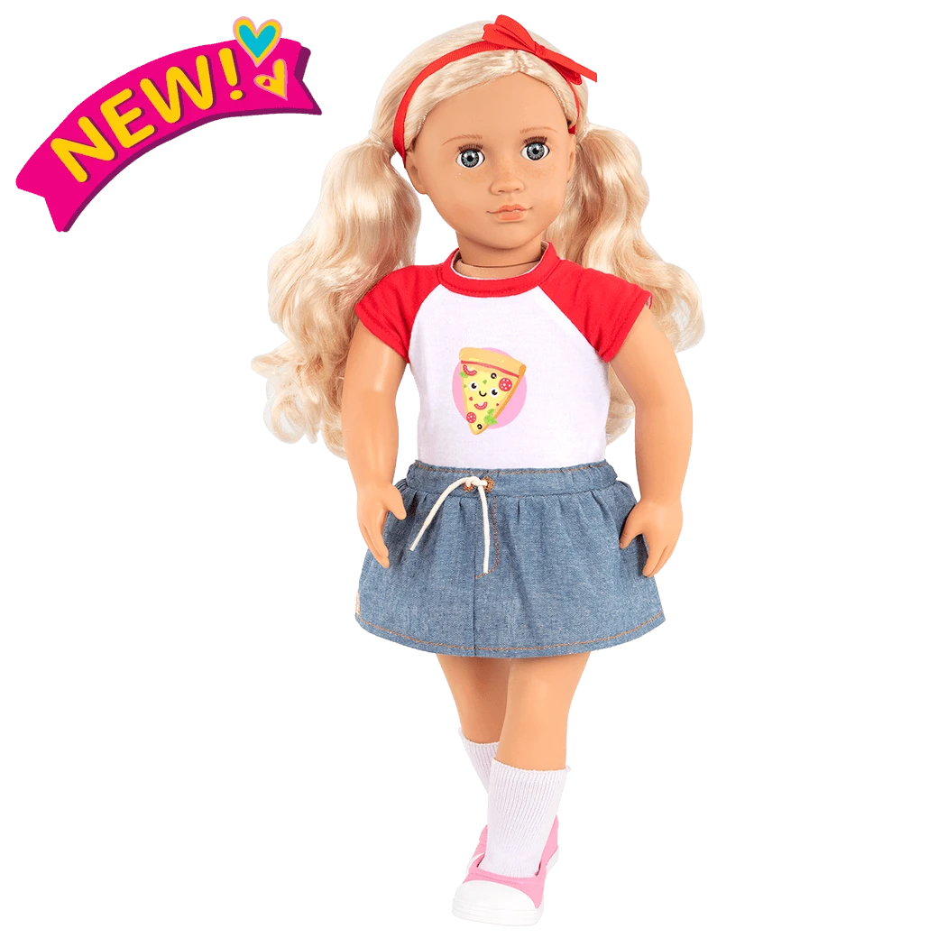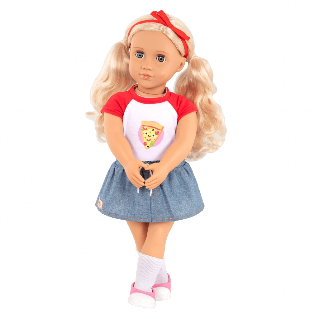 Explore fun fashion with Jolene! This Our Generation 18-inch doll has bright green eyes that open and close, and her long, wavy blonde hair is fun to brush and style! Jolene loves to express herself through colorful outfits and fun designs. She is wearing a red-and-white top with a happy pizza print, a denim-style skirt, knee-high socks, and pink-and-white shoes.