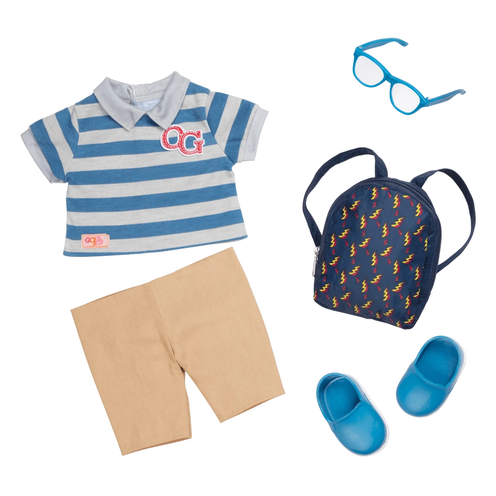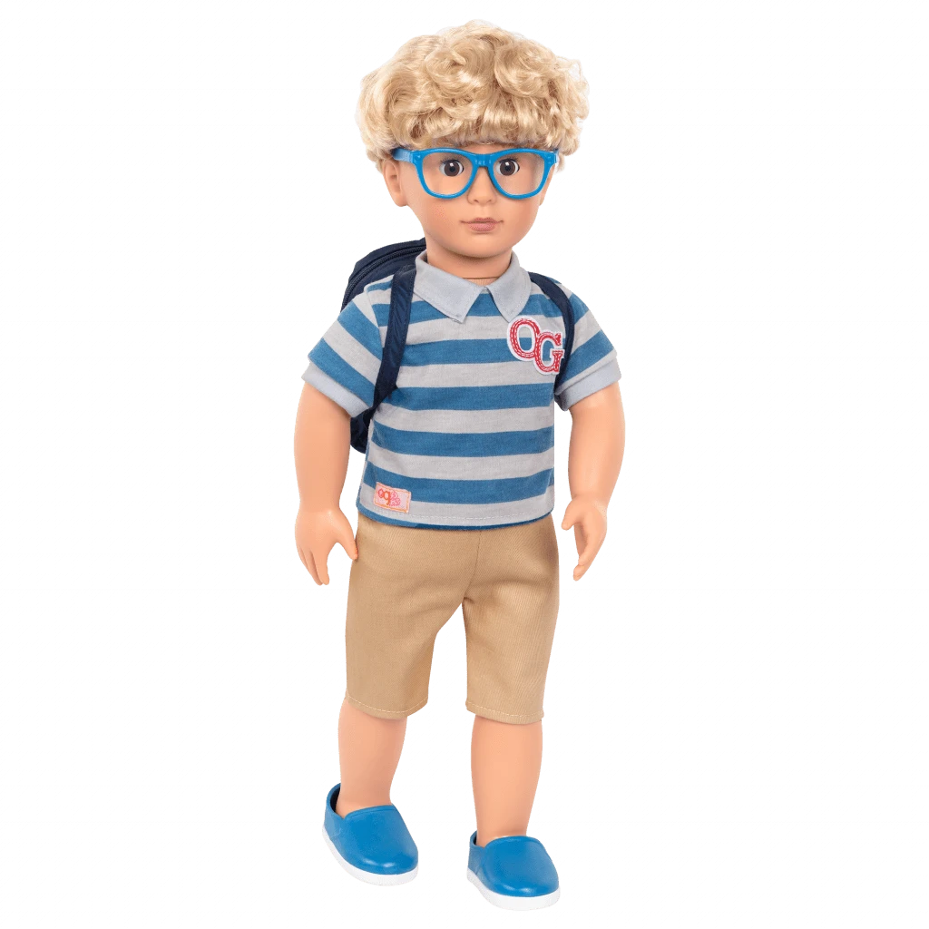 Learn your favorite subjects with Leo, the Our Generation 18-inch boy doll who loves everything about school! Leo has short, wavy blond hair and dark-brown eyes that open and close, and he can rotate his neck, arms, and legs to easily change outfits for each day he attends class. He arrives wearing a blue-and-gray striped polo with an OG crest, casual shorts, and sky-blue shoes with matching glasses.