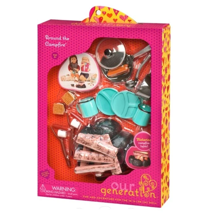 Get ready for the ultimate camping trip with the Campfire accessory set from Our Generation! This set includes a flickering bonfire, roasting sticks, marshmallows, hot dogs, s?mores, a pot, a pan, a ladle, two mugs, and two plates. Each piece is perfectly sized for Our Generation dolls (or other 18-inch dolls), bringing more personality and excitement to playtime