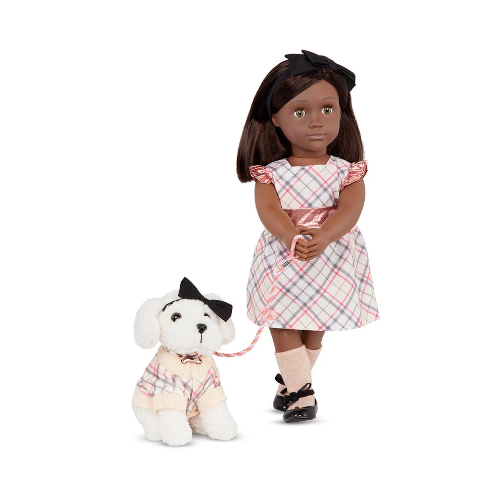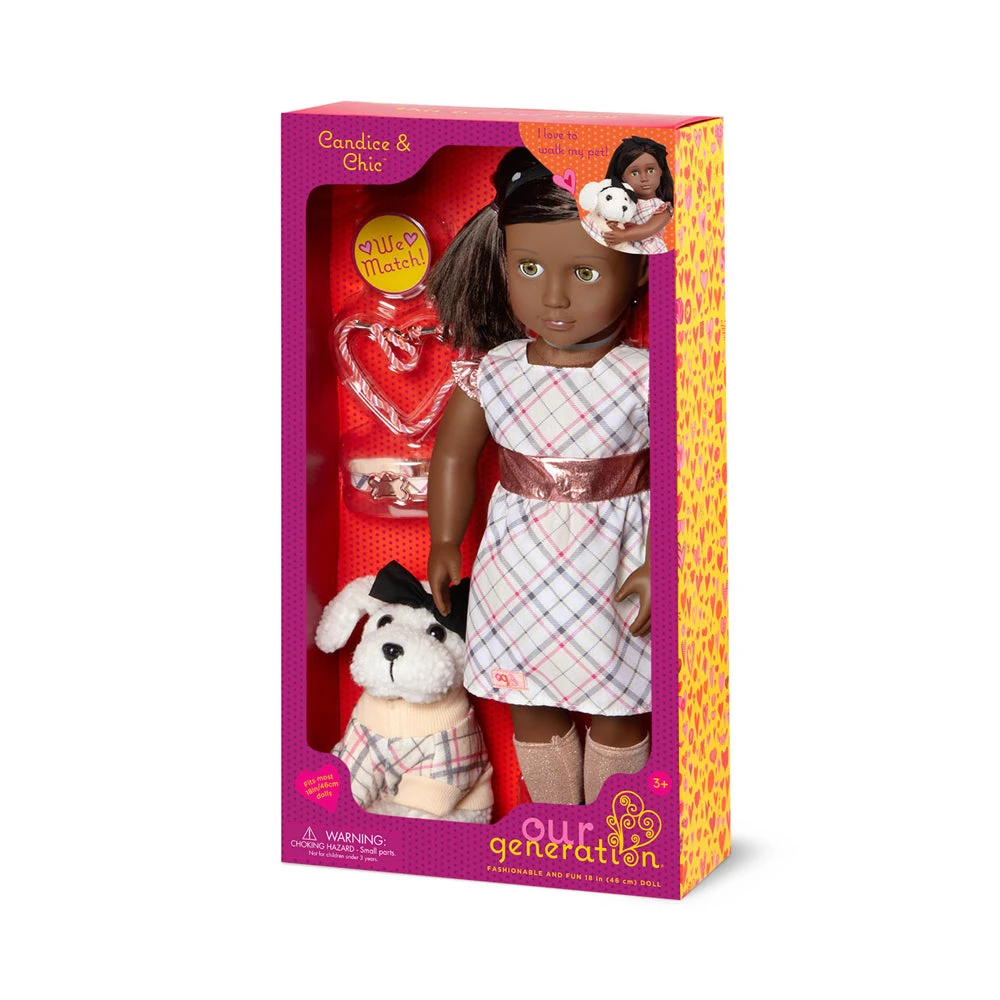 Embark on fun adventures with Candice and her stylish pup Chic! This Our Generation 18-inch doll and pet pair love twinning in their favorite fashion. Take Chic out and about with the dog leash. It easily clips to the collar and fits around Candice’s hand for trips to the dog park!