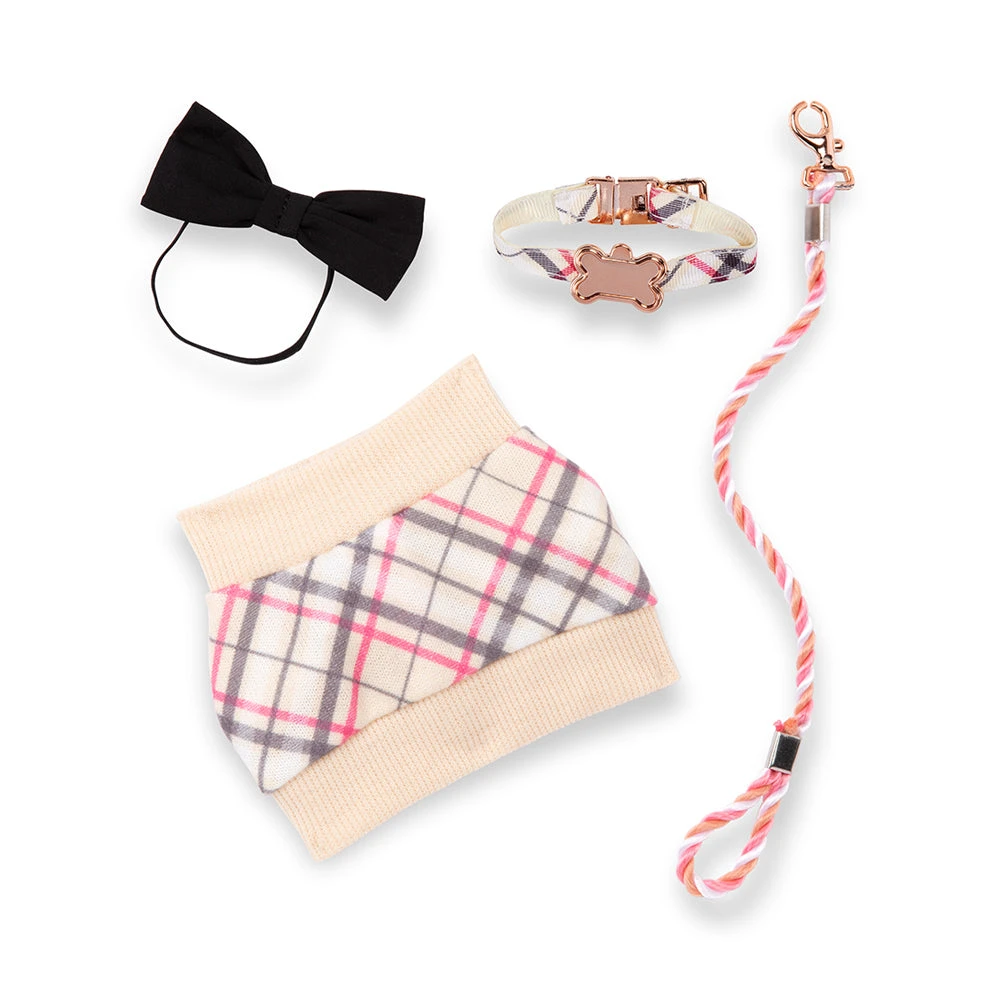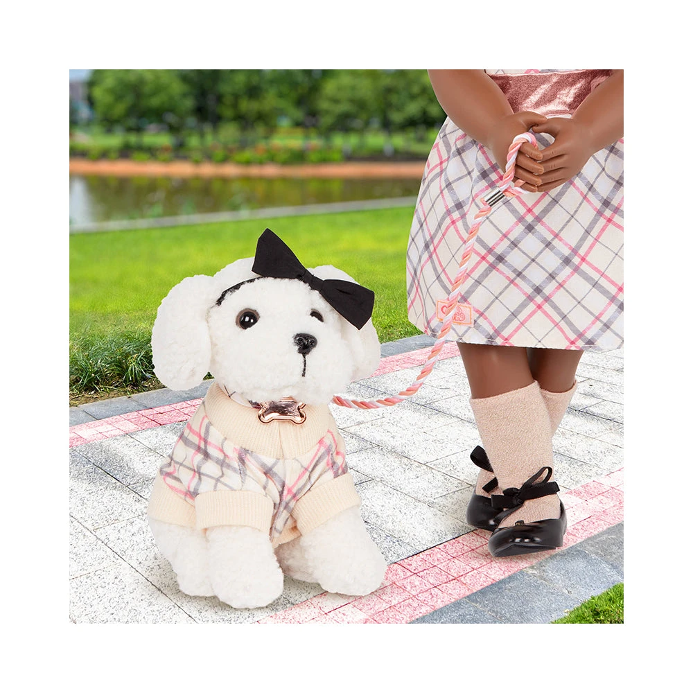 6-inch Dog Plush Chic: features soft, white-plush fur with dog collar, cute hair bow, plaid sweater, and attachable leash!