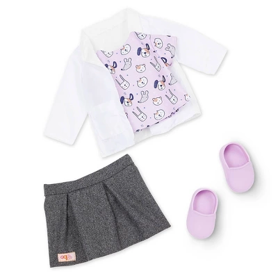 - Includes: 18-inch doll, scrubs top with cute animal prints, pleated skirt, undies, doctor’s coat, plush hamster, pair of shoes, stethoscope, clipboard, 2 medical forms, treats jar, pretend syringe, pen, and medicine bottle.