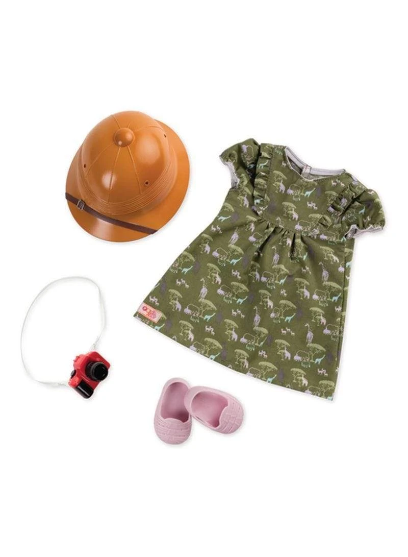 Includes: 1 poseable doll, 1 skirt, 1 t-shirt, 1 vest, 1 belt, 1 pair of undies, 1 pair of boots, 1 dress, I pair of shoes, 1 safari hat, 1 camera, 1 journal, 1 chapter book and 1 book mark