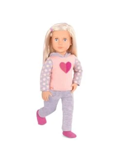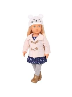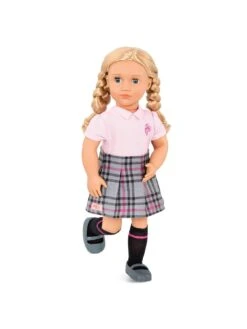 Cozy up the holidays with Bria, the beautiful holiday doll from Our Generation! Because our generation of girls is so full of warmth, even when the cold in the air bites our noses we’re learning what’s really important in this world. We collect leaves to earn money for gifts, sweep our neighbors’ driveway, and even volunteer to turn the school cafeteria into a sparkling wonderland perfect for celebration. This beautiful doll features long straight blonde hair with a sparkly embroidered headband to add extra holiday sparkle. You can have fun styling her hair in all kinds of different ways! Bria wears a perfect outfit for the holiday party, including a red velvet dress with a plaid bodice and a shiny gold bow as a belt. They come with leggings and dress shoes to add an extra special touch to holiday whimsy