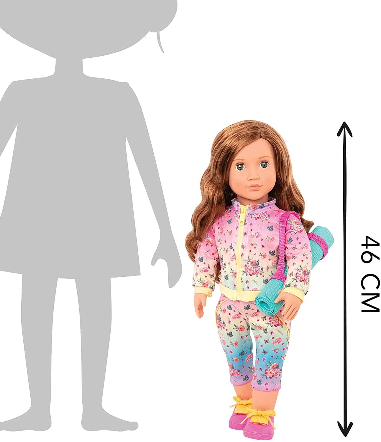 Lucy Grace (Heloisa Lolo) loves yoga! She wears a pretty yoga training outfit printed with enchanting flowers, leaves, and butterflies. Her matching pink and yellow sneakers are perfect for a stroll after her yoga class. Her yoga mat looks and feels just like yours! Use the strap as both a handy way to carry her yoga mat, or as a yoga strap to help stretch.