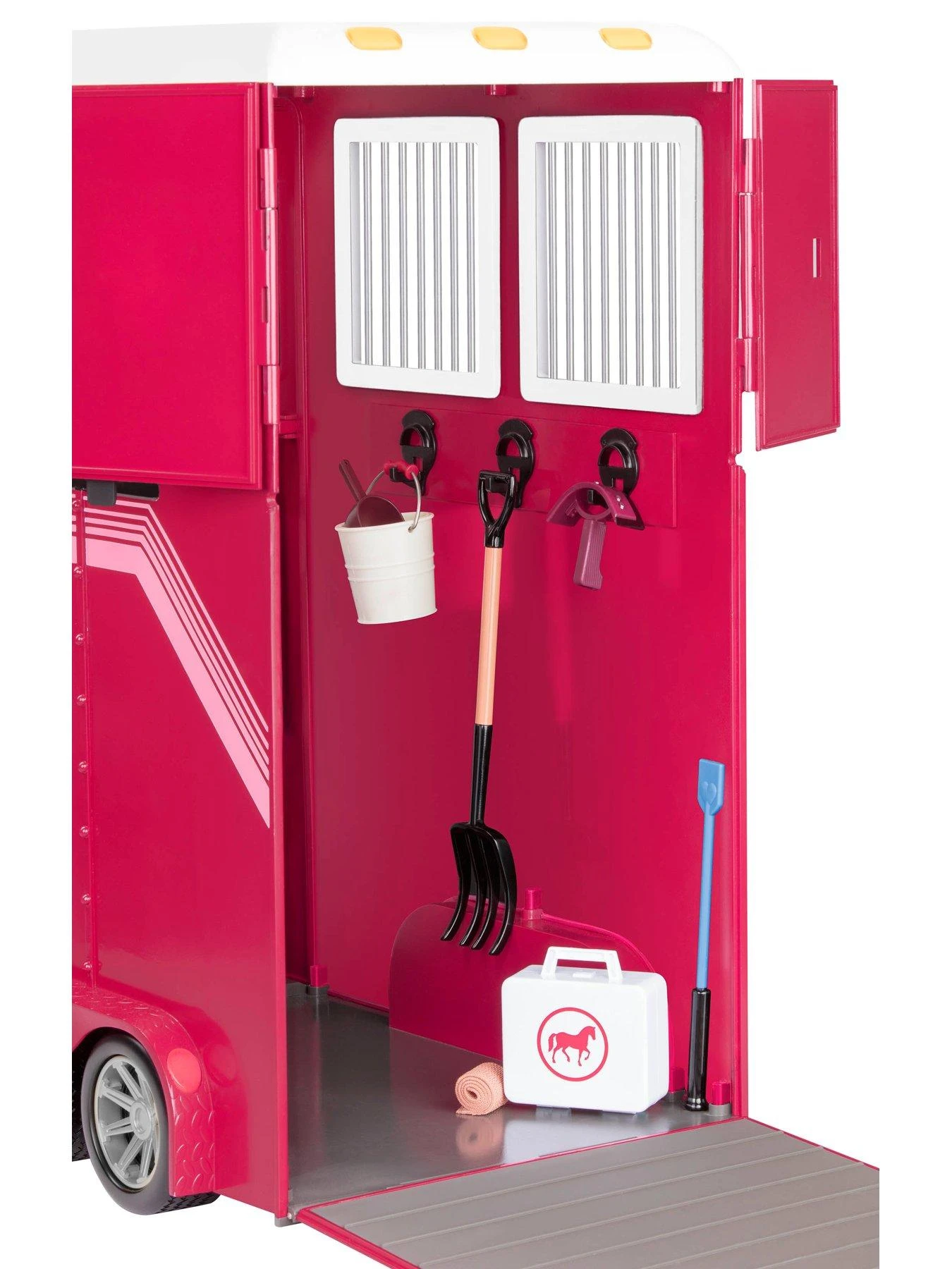 This deluxe horse trailer for 18-inch dolls has so many fun accessories, you’ll see why the word “neigh” rhymes with “Yay!”. Fun Equestrian Accessories for 18-inch Dolls!