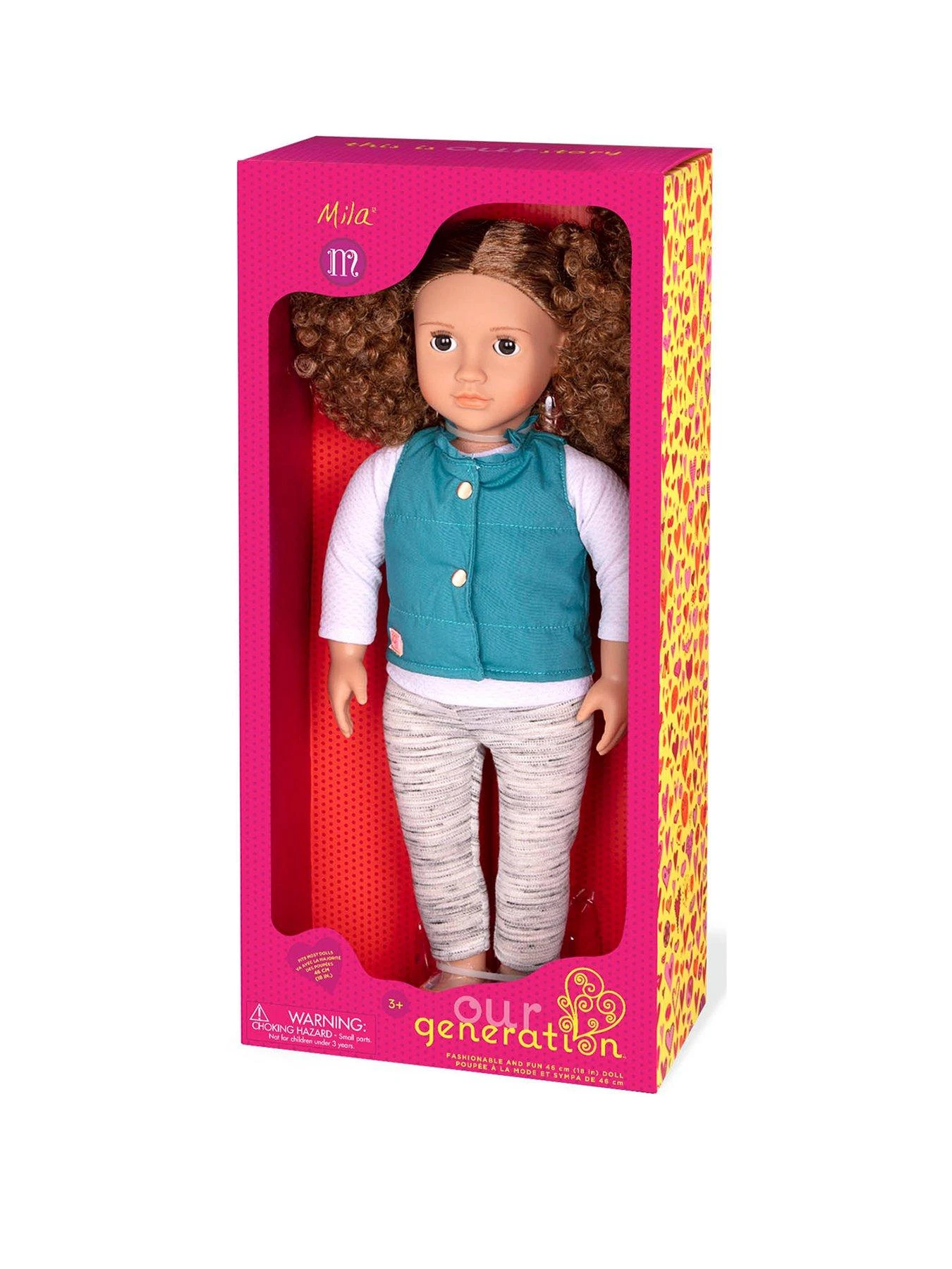 Mila has warm brown eyes that open and close and long, curly brown hair that’s lots of fun to brush and style! Mila is wearing a long-sleeved shirt with a buttoned-up frilly vest over top, a pair of cozy leggings and cute casual shoes.