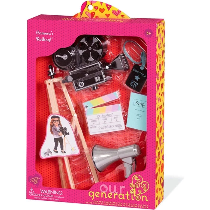 Start filming your next big movie with the Our Generation Camera?s Rolling accessory for 18-inch dolls! Tell your actors and actresses to take their places with the speaker megaphone, and flip through the script to create new and exciting scenes! Once your dolls have rehearsed their parts, set up the camera to start filming ? you can even turn the reels! Just click the clapperboard when it?s time to begin and watch your imagination create magic! Build a realistic filming studio and cast your favorite dolls with their awesome friends ? and of course, a cameo appearance from you! After all, every movie needs a superstar! (Dolls sold separately)