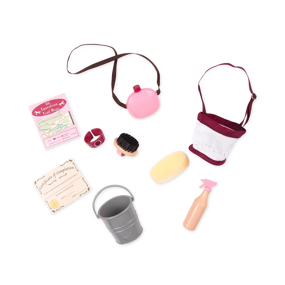 Includes: horse, saddle, bridle with reins, saddle blanket, wrist watch, certificate, trail map, feed bag, sponge, canteen, brush, bucket, and spray bottle.