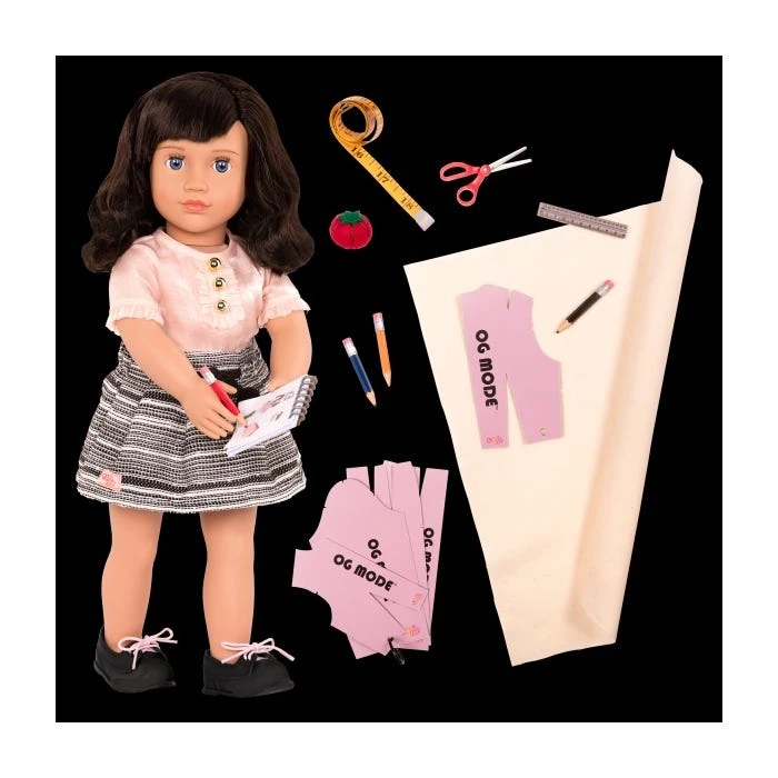Dream up wonderful fashion styles with Olinda, a beautiful Our Generation 18-inch designer doll! She has pale blue eyes that open and close, and her wavy, shoulder-length black hair is lots of fun to brush and style! Olinda always has her design accessories ready; inspiration can happen at any time! Look in Olinda?s sketch book to see what she?s designed so far, and use your imagination to create new styles with the pretend pencils and scissors, measuring tape (18.5?), ruler, pattern boards, and fabric sample. Olinda made her sweet pink blouse and striped skirt herself, and it also has easy-open closures that make it fun to mix and match with other colorful Our Generation selections. Which outfit will Olinda create next?