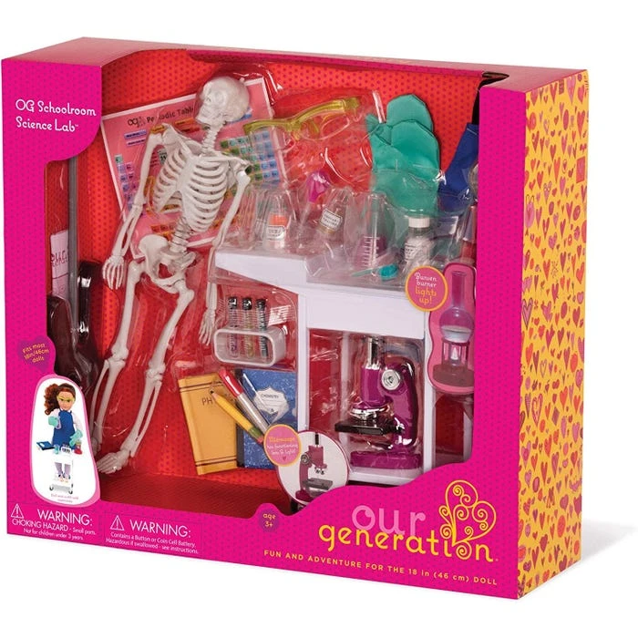 Eureka! Help your 18-inch dolls make their next big discovery with the Our Generation Schoolroom Science Lab accessory set! This science class laboratory set has all kinds of great STEM accessories for dolls that are sure to spark their imaginations. Dress your dolls in the lab apron and protective gloves to keep them safe while they conduct their experiments. Set up the rolling work bench with the test tubes, flasks, and beakers and practice mixing up interesting new solutions. The Bunsen burner really lights up! Use the light-up mini microscope to investigate even the smallest details. The lens really works! The model skeleton is the perfect way for your dolls to learn about anatomy?and makes a fun laboratory friend, too! (What name will you give to your skeleton? We like calling it Telly the Skelly!) And the doll-sized periodic table will make sure that your dolls know their Potassium from their Magnesium. STEM toys like this science set encourage children to get involved in the sciences and are a great way to bring elements of learning into play.