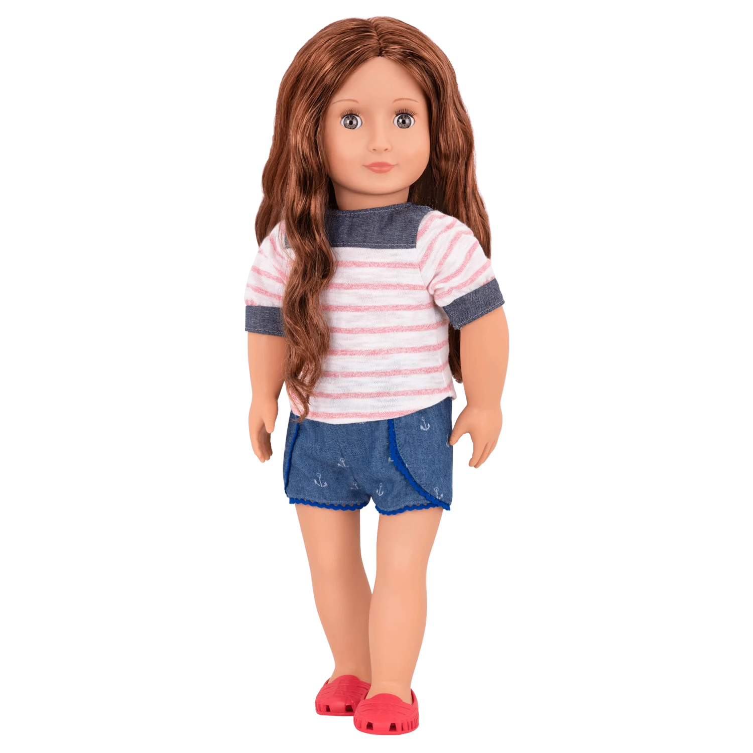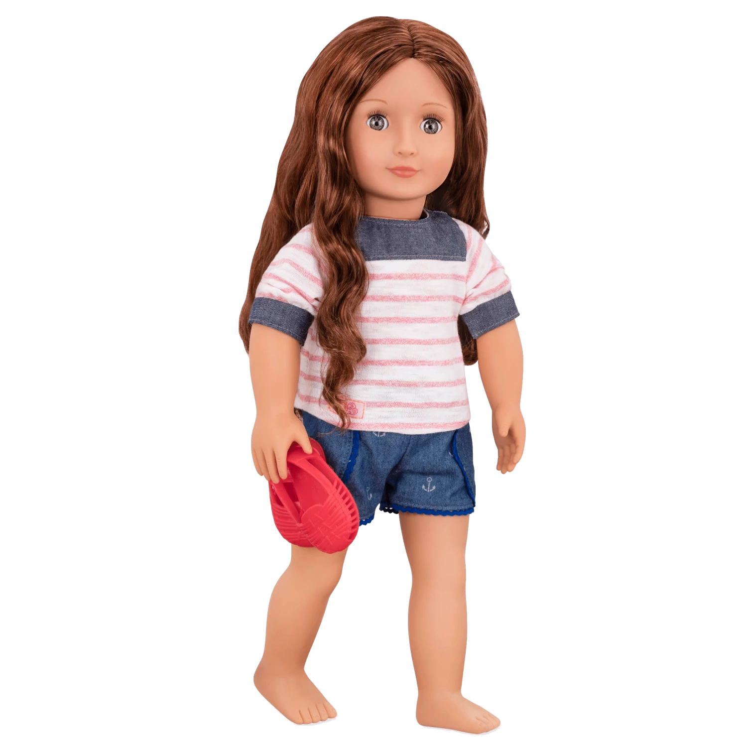 Our Generation Shailene Doll is ready to go to the beach. She can be a companion to your child as they explore the outdoors. This toy doll is dressed in a short-sleeved shirt and shorts while holding her shoes. Her long, brown hair flows down to her waist, creating a laidback image of summer fun. She can be easily taken along on family vacation or on overnight stays for comfort and entertainment. The clothes in this set will easily fit many other 18″ dolls of similar design that your child may own, making even more fun exchanging outfits. This toy would make an ideal gift for the doll lover in your life. It will look nice displayed in a glass case for collectors.