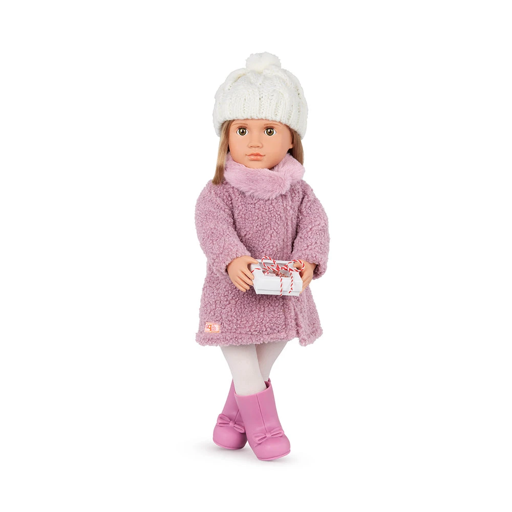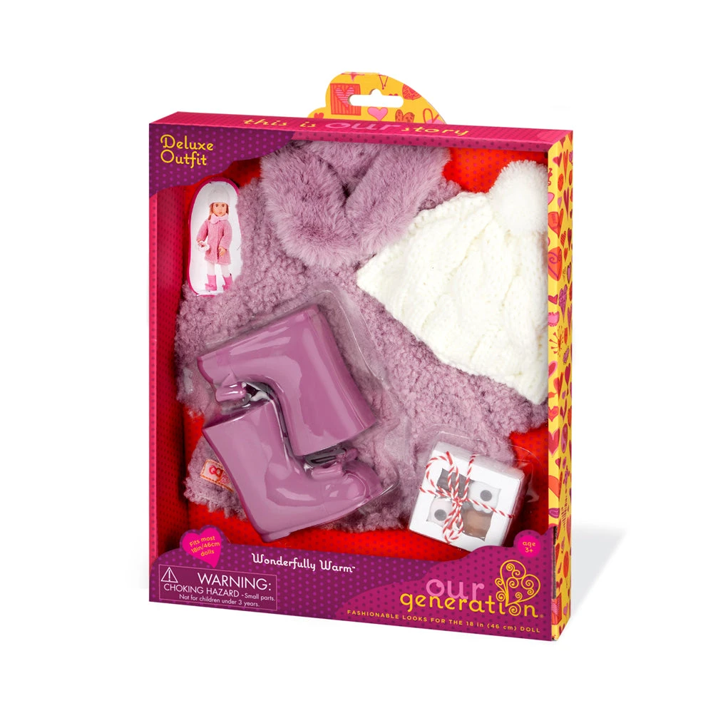 Bundle up your 18-inch doll with the Our Generation Wonderfully Warm outfit and celebrate chilly days together with friends! Dress your bestie in the snuggly sherpa coat with the faux-fur lined collar ready to head outdoors. Complete the look with the cute pom pom hat and stylish booties. Then grab the treat box to deliver a sweet surprise – it’s filled with 4 delicious cookies and neatly wrapped with a pretty bow! Outfit has easy-open closures to quickly put on and remove, so your Our Generation dolls can mix, match, and look fashionable on every fun adventure!