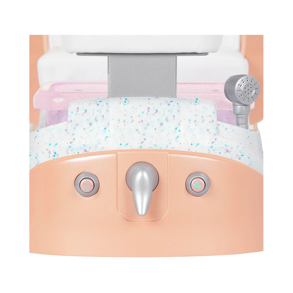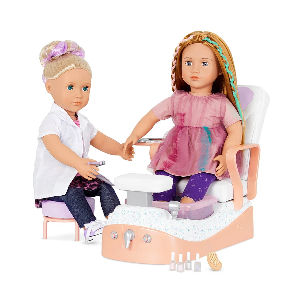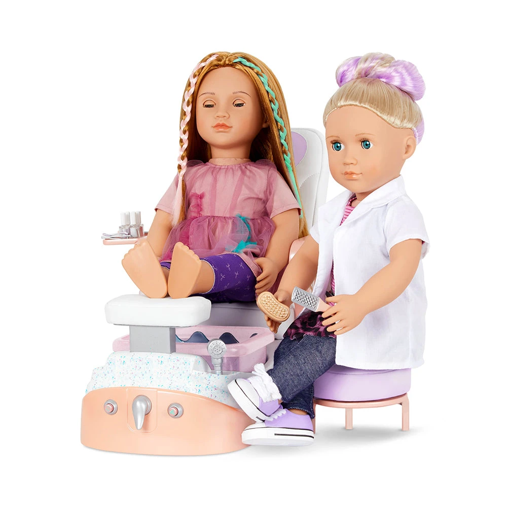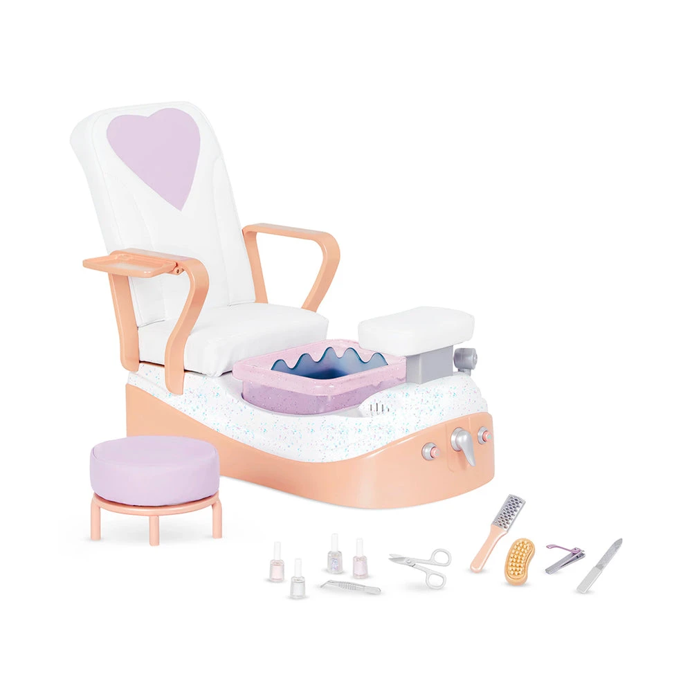 Relaxation and pampering await in the Our Generation Yay, Spa Day Chair for 18-inch dolls! Seat your dolls in the cushioned chair as you fill up the footbath with the realistic water and bubble sounds to make pretend-play spa days extra fun. Then play the music as you prep for a lovely pedicure! Use the foldable tray on the armrest to hold the cute accessories to complete your doll bestie’s mani-pedi. It includes a foot scrubber, scissors, nail file, tweezers, nail clipper, and foot brush with real bristles. The padded stool will keep your doll assistants comfy as they add bright colors with the 4 nail polish bottles! (Dolls sold separately)